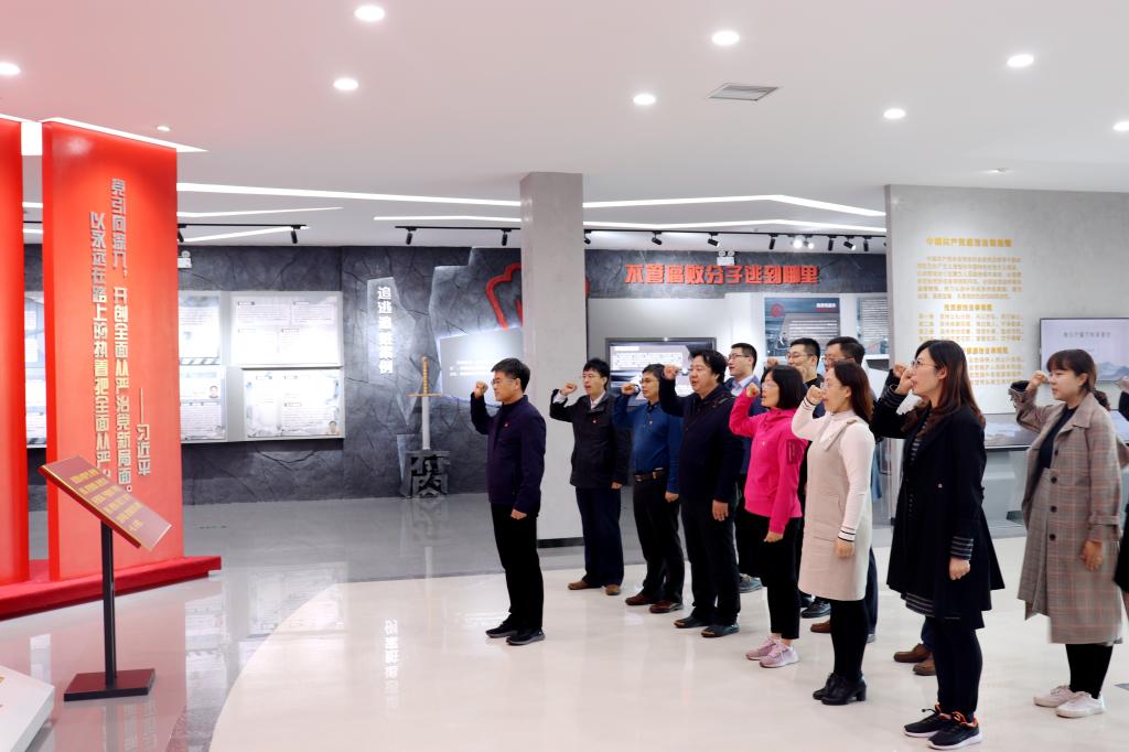 宋西路一行先后参观了誓言区、警示区、忏悔区和廉律区等展区,详细学习了党的十八大以来违反政治纪律和政治规矩案例、违反中央八项规定精神案例、形式主义和官僚主义案例、严重职务违法犯罪案例、重点领域职务违法犯罪案例、涉黑涉恶腐败和“保护伞”案例、扶贫领域专项治理案例、小官贪腐案例和追逃追赃案例,观看了《失联的背后——青岛市城市管理局原党委书记、局长郭继山严重违纪违法案件警示录》。参观最后,宋西路带领大家在誓言区面对党旗一起重温了入党誓词,共同回顾了当初入党时的初心与使命。