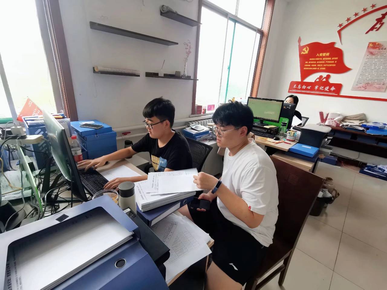从8月8日至8月14日,团队成员分成两组,一组在组织办公室整理了当地2400余份党员材料,另一组在退役军人办公室完善地录入了1300余份退役士兵的信息。两组队员分工明确各司其职,高效并行,出色地完成了任务。