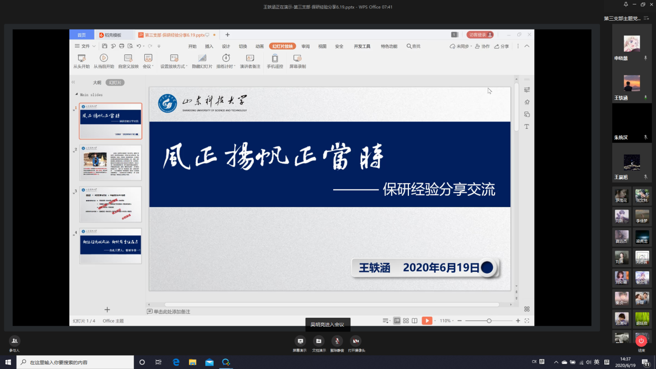 6月19日,MG冰球突破官网网站本科生第三次党支部通过企业微信平台举办“榜样的力量”分享交流会。此次党日活动由党支部书记朱统汉主持,邀请了四名毕业生党员向低年级同学分享经验。
