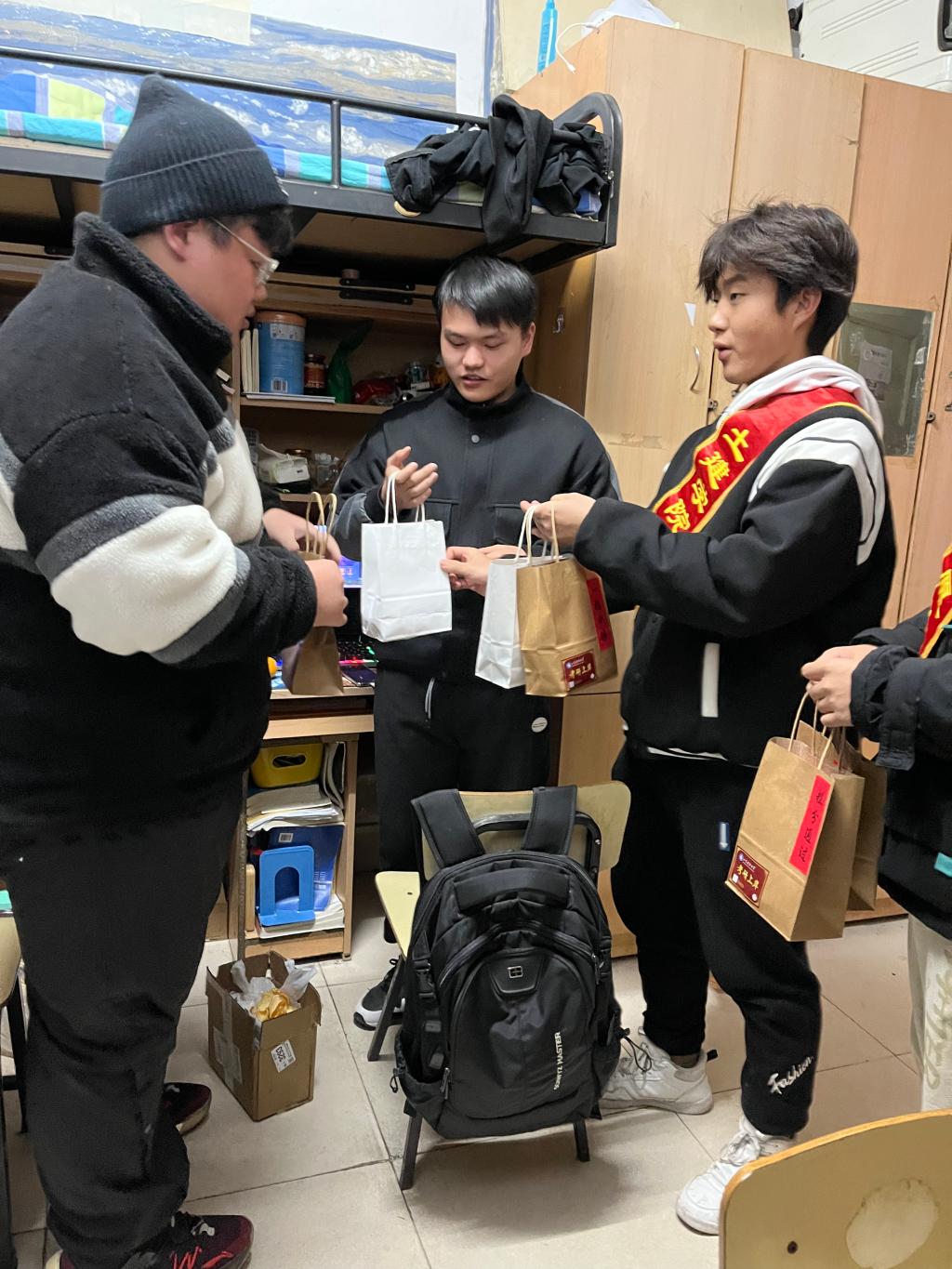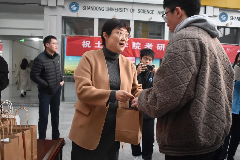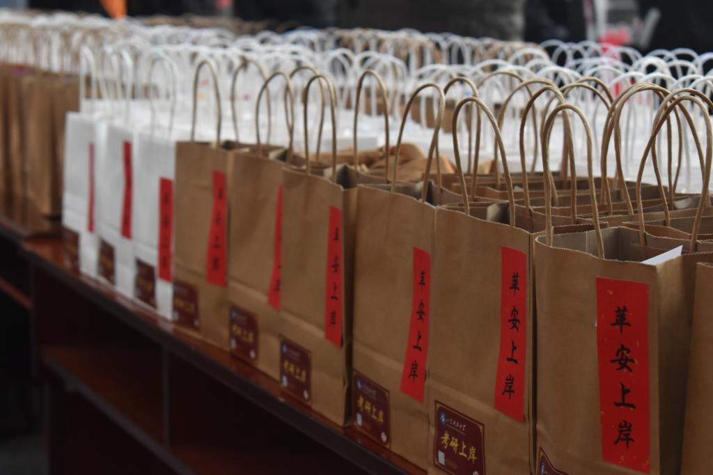 活动伊始,宋西路为现场参加活动考研学子送上了殷切祝福,他充分肯定了同学们坚持学习、克服困难、勇攀高峰、追求梦想、敢于挑战的精神,提醒大家在认真备考之时要注意身体,合理调整作息,以最佳状态迎接考试,祝福考研学子一战成硕,心想事成。活动中,宋西路、高静和辅导员们将饱含祝福的“考研加油福袋”亲手送给现场每一位考研学子,贴心地询问复习进度和生活情况,并祝愿同学们考研顺利。此外,学院还安排志愿者深入考研学生宿舍为未能到现场参加活动的考研学子送上“考研加油福袋”,确保每一位考研学子都能感受到来自学院和老师的关心与祝福。