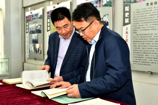随后,杨小林一行来到MG冰球突破官网网站,参观了陈子荫先生塑像、MG冰球突破官网网站院史展,翻阅了陈子荫先生生前保留的许多著作、论文、手稿等原件。王崇革为来宾介绍了学院的发展历程、学科和专业建设及杰出校友。来宾对以陈子荫先生为代表的冯豫、周文安、胡峰等老一辈专家学者集体对山科大矿井建设学科发展奠定了坚实的基础表达了敬意。之后,杨小林一行深入学院土木工程实验中心调研。